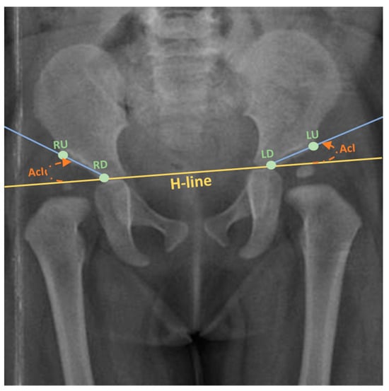 The current clinical approach for diagnosing DDH involves manual measurements of various anatomical characteristics from pelvic radiographs, followed by assessment by experienced clinicians or radiologists. However, this process lacks standardization and heavily relies on subjective metrics, demanding a greater degree of knowledge and clinical experience. Recent advancement in computer-aided medical diagnosis (CAD) supplemented with pattern recognition techniques have made it feasible to incorporate these technologies into practical solutions that offer an automated, standardized, and reliable diagnosis of DDH in infants. These solutions utilize the acetabular index angle measurement (AcI) as a clinically established radiographic measurement for assessing the severity of DDH in individual cases (Figure 1). AcI is measured by calculating the angle between two lines. The first line extends from the medial edge to the most lateral aspect of the acetabular sourcil, which refers to the inner rim of the acetabulum. The second line, known as Hilgenreiner’s line, or H-line, runs horizontally on the pelvis. The degree of the angle formed by their intersection indicates the range within which the acetabular index falls. An increased acetabular inclination range is indicative of the presence of DDH [6].