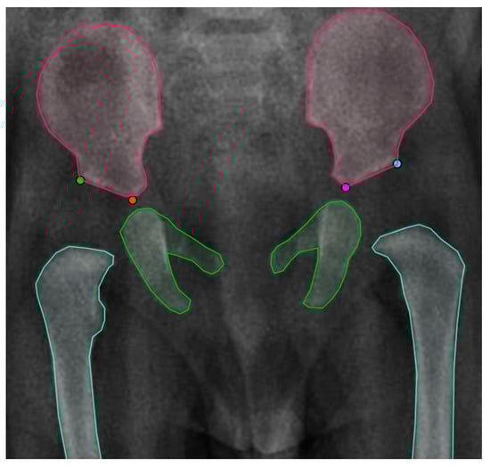 The tool CVAT [36] was utilized to annotate the X-ray images. CVAT is an open-source video and image annotation tool. It offers various annotation features for object detection, semantic segmentation, and classification. First, the four landmarks that lie on the Hilgenreiner line and the lateral aspect of the acetabulum roof that passes through the acetabular sourcil’s medial edge were annotated as one object. Each point was labeled according to its position in the X-ray image (left up, left down, right up, right down) indicating the left and right side of the acetabulum superolateral margin and tri-radiate cartilage center. Additionally, the X-ray images were labeled for image segmentation in polygons. The ilium is the upper bone, the pubis, the ischium is the middle bone, and lastly, the femur is the lower bone using the polygon tool. Figure 2 shows the instance segmentation and keypoint labeling.