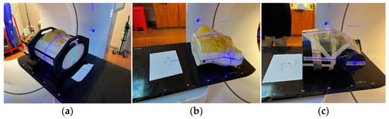 Setups of each phantom: (a) CIRS, (b) 3D-printed phantom, and (c) Rando at the Halcyon table.