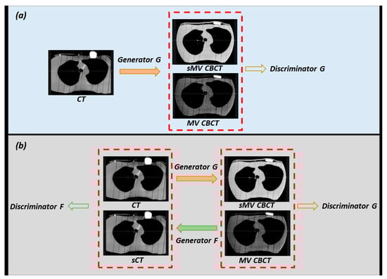 In this study, two deep learning models, conditional GAN (cGAN) [24] and cycleGAN [25,26], were used to translate the CT/kV CBCT images to MV CBCT. Their frameworks are shown in Figure 2. The generator and discriminator networks in GANs work in opposition to each other, with the generator aiming to generate realistic synthetic images and the discriminator trying to distinguish them from real images. The training process involves improving the ability of generators to create realistic synthetic images while simultaneously improving the ability of discriminators to accurately differentiate between synthetic and real images.