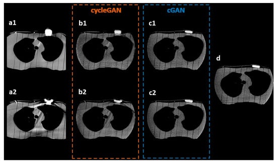 The efficacy of the trained models in enhancing the visualization of pacemakers was evaluated by comparing the sMV images generated by cGAN and cycleGAN with the ground-truth MV CBCT images. The results of the visual comparison are presented in Figure 3, including the axial views of the original CT/kV CBCT images (a1, a2), the corresponding real MV CBCT image (d), and the synthetic images generated by cycleGAN (b1, b2) and cGAN (c1, c2).