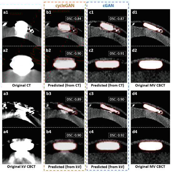 As depicted in Figure 3, the results of the visual comparisons indicate that the cGAN model outperforms the cycleGAN model in improving the visualization of pacemakers. Specifically, the cGAN models generate sMV CBCT images (c1, c2) that more closely resemble the actual shapes of pacemakers, as seen in the original MV CBCT image (d). To effectively compare the performance of cGAN and cycleGAN, the pacemakers were manually delineated on both sMV and real CBCT images. The comparison of these contours is shown by the red lines in Figure 4. The results show that, for the same input kV CT/CBCT images, cGAN models consistently generated more accurate pacemaker shapes in sMV CBCT images, as illustrated by the comparison of their contours.