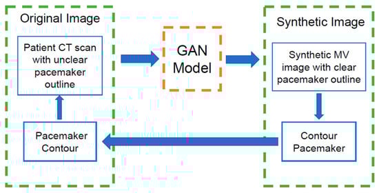 In recent years, GANs have been investigated to address the problem of medical image artifacts in dose calculation for treatment planning. Research has been conducted into the use of GANs in the accurate generation of synthetic CTs [12,13]. GANs have also been investigated for multi-modal medical image generation (e.g., MR to CT, CT to PET, or CBCT to CT), dose reduction, and image artifact removal [14,15,16,17,18]. Gomi et al. reported adequate artifact removal in digital tomosynthesis at up to 55% radiation dose reduction after the extensive model optimization of GAN architectures to minimize the mean squared error and structural similarity [19]. Another study by Liao et al. reduced metal artifacts on CT and CBCTs by correcting the affected regions through joint projection–sinogram correction and adversarial learning [20]. While GANs have been employed in various MAR research contexts, their application to addressing artifacts caused by cardiac pacemakers in CT/CBCT images, which obscure the outlines of these devices, has not been explored.