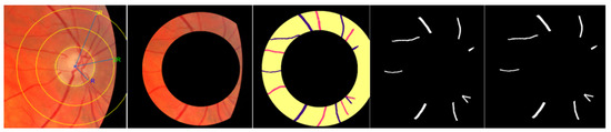 - Agurto, C.; Joshi, V.; Nemeth, S.; Soliz, P.; Barriga, S. Detection of hypertensive retinopathy using vessel measurements and textural features. In Proceedings of the 2014 36th Annual International Conference of the IEEE Engineering in Medicine and Biology Society, Chicago, IL, USA, 26–30 August 2014; pp. 5406–5409. [Google Scholar] [CrossRef]