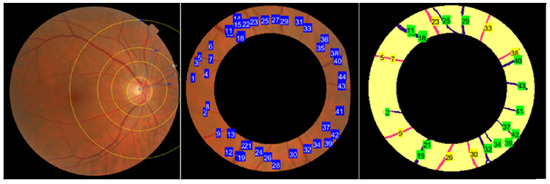 - Arteriovenous Sum of Angles Metric Ratio: This metric is the average tortuosity inflection count divided by its ratio. Comparing the average inflection count metric of all arteries to the binomial of all veins in the retinal image; it assesses the binomial distribution of artery and vein inflection points.