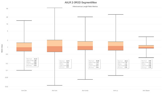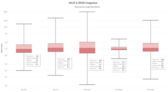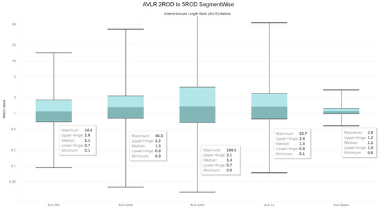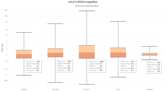 - In order to evaluate the difference between the lengths of the arteries and veins, the arc and chord lengths may be substituted because of the normal distribution of both ratios. In the meanwhile, for certain pictures in the AV-Classification dataset, the box plot in Figure 20 shows that the arteriovenous tortuosity ratios in (4)–(9) are skewed above the mean and median. This observation leads us to the following conclusions: