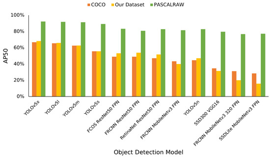 AP50 of each object detection model on our dataset, the COCO validation dataset, and the PASCALRAW dataset.