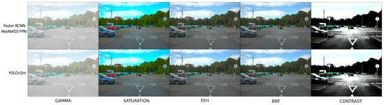 To investigate this method of data augmentation, an algorithm is trained, once on a default ISP configuration, and once with a number of ISP configurations that substantially deviate from this default configuration, as described in [58], and the performance of these models are then evaluated in the same manner as in Section 3. The ISP blocks chosen to perturb within this section are gamma, EEH, BNF, contrast, clip limit, and saturation. Faster RCNN with the ResNet50 FPN backbone has been selected as the model under test, and the dataset, processed with various ISP configurations, is utilized as the training data. The training was carried out with no other augmentations for 30 epochs and used default training hyperparameters in both cases.
