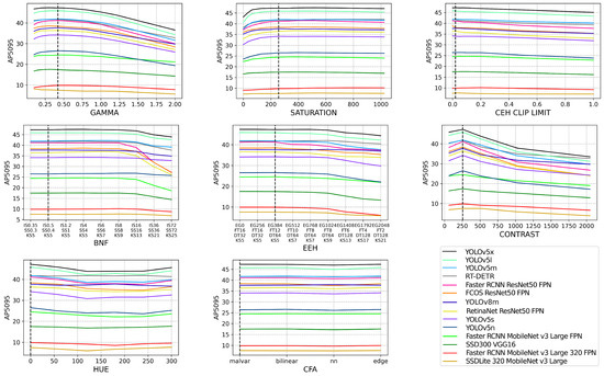 The raw dataset is processed via OpenISP [11,12] using a default ISP, however, with an altered parameter, denoted by the x-axis of each subplot. Each subplot refers to a different ISP block and the full set of parameters utilized can be seen in Table 3. Each of the 14 object detection models is then evaluated on each altered ISP dataset and their AP5095 performance can be seen on the y-axis of each subplot. The black dashed line denotes the default ISP configuration for each ISP block.