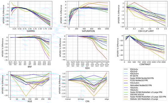 The raw dataset is processed via OpenISP [11,12] using a default ISP, however, with an altered parameter, denoted by the x-axis of each subplot. Each subplot refers to a different ISP block and the full set of parameters utilized can be seen in Table 3. Each of the 14 object detection models is then evaluated on each altered ISP dataset and their AP5095 performance is taken as a relative percentage difference to their AP5095 performance on the default ISP configuration dataset. The default ISP configuration is denoted by the black dashed line on each subplot.