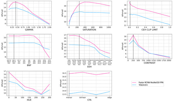 In Figure 7, we take a closer look at the smaller objects for a subset of the object detection models by utilizing the COCO APsmall metric. YOLOv5m (YOLO) and Faster RCNN ResNet50 FPN (FRCNN) have been chosen for this subset as they represent single- and two-stage algorithms and achieve a similar AP5095 performance. Given that the APsmall metric was intended for the COCO dataset, with lower resolution images relative to our dataset, the APsmall threshold has been scaled accordingly from 32 px to 150 px. With a default ISP applied to the dataset, FRCNN has an APsmall of 16.66%, whereas YOLO has an APsmall of 13.74%, a 2.92% difference, illustrating that FRCNN is better at detecting smaller objects. When looking at AP50, however, YOLO has an 8.87% lead over FRCNN, but FRCNN leads YOLO by 0.25% when looking at AP75, highlighting that YOLO is better than FRCNN at detecting larger objects. We can see in Figure 7 that even though FRCNN is much better when predicting smaller objects with a default ISP, it is more sensitive than YOLO when the ISP is varied as the performance of APsmall in FRCNN matches or drops below that of YOLO when varying BNF, saturation, and contrast. Figure 7 shows that varying the ISP across FRCNN and YOLO disproportionately affects smaller objects as the performance starts to degrade with less variation from the default ISP configuration, and the overall performance degradation at the extremes is higher than when looking at all objects in Figure 5.