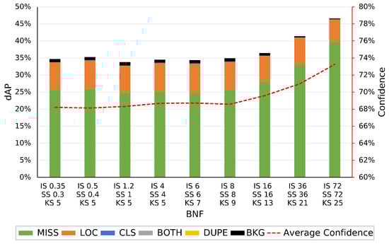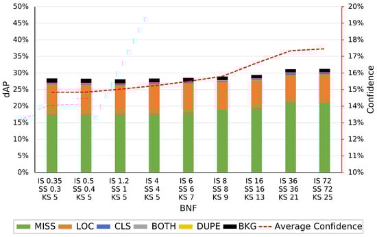 The raw dataset is processed via OpenISP [11,12] using a default ISP, however, with altered BNF parameters, denoted by the x-axis. The left y-axis shows the errors, in dAP, determined using TIDE for the YOLOv5m model. The right y-axis denotes the average confidence of the model over the various altered datasets.