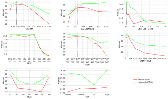 The APsmall results for both the default and augmented models can be seen in Figure 10. The APsmall metric is used as the detection of smaller objects has been shown, in Figure 7, to be more sensitive to changes in the ISP than the overall AP metric in Figure 5. Figure 10 shows that the augmented model outperforms the default model throughout the evaluation. Comparing the default to the augmented model, the augmented model has gained the most resiliency to the changing contrast, with a >5% performance gain at the most extreme contrast configuration. While the augmented model outperforms the default model in the BNF testing up to a point, both begin to degrade at the same point and degrade at the same rate. This infers that there is a limit to the blur resiliency that data augmentation can achieve and this limit sets a minimum level of sharpness needed for object detection.