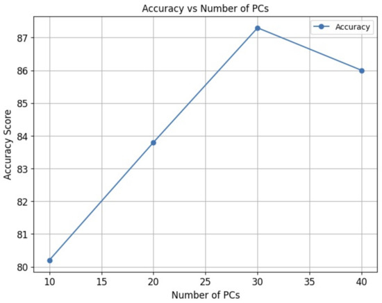 Figure 1 presents the performance results of the XGBoost machine learning models using different numbers of principal components for the low + high spectral region. Specifically, using 10 PCs and 20 PCs resulted in an accuracy of 80.2% and 83.8%, respectively. Notably, the higher accuracy of 87.3% was reached by using 30 PCs while with 40 PCs the accuracy decreased to 86%.