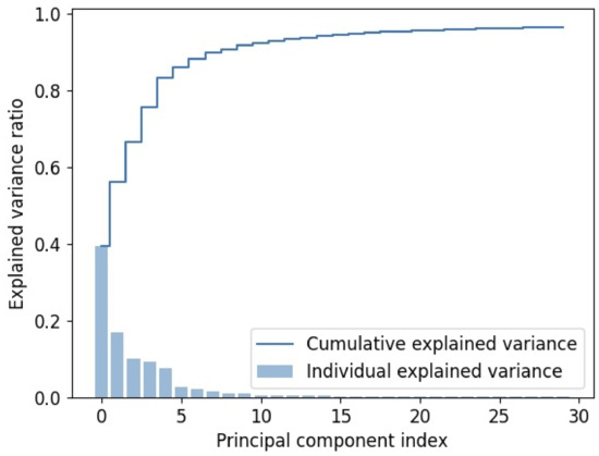 The variance plot (Figure 2) presents the cumulative explained variance which reached 96.4% and the individual explained variance of the low + high region with 30 PCs. The plot displays the principal component index on the x-axis and the explained variance ratio on the y-axis. It reveals that the first few PCs capture a significant portion of the variance, with diminishing returns observed as more PCs are included. This indicates that a low portion of variance PCs can effectively capture the essential information present in the spectral data. Thus, the selection of 30 PCs is the appropriate choice for achieving a balance between dimensionality reduction and maintaining sufficient explained variance for accurate classification of healthy and cancerous tissue samples.