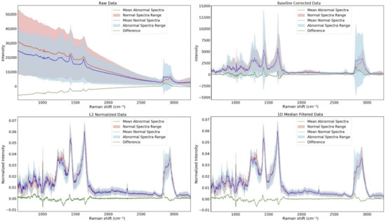 Mean spectra of both normal and abnormal classes and their difference. (top left): Raw spectra, (top right): spectra after baseline correction, (bottom left): spectra after applying L2 normalization, and (bottom right): spectra after applying 1D Median Filter.