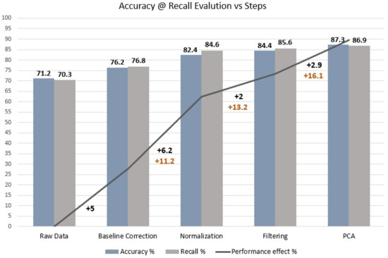 The results are presented in Figure 4. The baseline correction, the L2 normalization, the filtering, and the PCA offer a boost in accuracy of 5%, 6.2%, 2%, and 2.9%, respectively. Overall, the improvement in accuracy and recall reached a total of 16.1% and 16.6%, respectively.