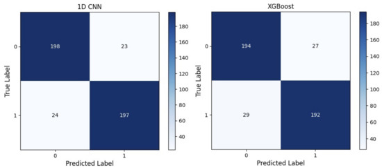 Confusion matrix: 1D-CNN and XGBoost. The labels 0 and 1 correspond to healthy and cancerous tissues, respectively.