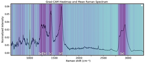 Figure 6 provides a visual representation via gradient-weighted class activation mapping (Grand-CAM) [27] of the varying levels of importance or activation of features within a 1D CNN model when applied to Raman spectra data. This heat map helps in interpreting the predictive capabilities of the model by highlighting the regions of the input spectra that contribute the most to the final prediction. Spectral regions that mostly affect the decision making of the 1D-CNN model are the regions of 1210–1280 cm−1, 1290–1350 cm−1, 1410–1472 cm−1, 1617–1687 cm−1, and 2840–2945 cm−1 (regions [a]–[e] in Figure 6).