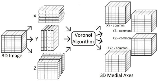 In this study, an automatic 3D divide and conquer Voronoi diagram method [] is applied for coronary artery centerline extraction. The divide and conquer aspect refers to the fact that any 3D image can be partitioned into several 2D images, allowing a 2D Voronoi diagram algorithm to be applied to each 2D image individually. In this approach, a 3D segmentation is first divided into multiple 2D images in the x, y, and z directions. Then, a Voronoi algorithm is applied to each of the generated 2D images to extract centerline points from every slice along each of the planes. The extracted 2D centerlines are then stacked along their corresponding slicing directions to create 3D medial surfaces (i.e., in the X-direction, Y-direction, and Z-direction), and the common medial surfaces are then determined from the intersections between any two (XY-common, YZ-common, XZ-common) directions, as well as the intersections between all three (XYZ-common) directions (Figure 1). Complete theoretical and methodological details of the automated 3D Voronoi-based centerline extraction method itself have been previously described in detail [], so the remainder of the current manuscript will focus on evaluating its performance when applied for automated coronary artery centerline tracking.