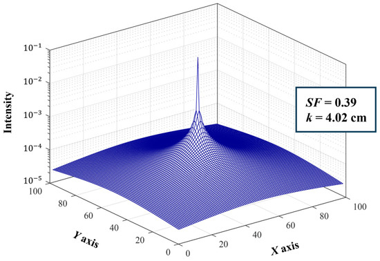 2D sPSF used in the simulation to generate scattering images. The parameters used in the sPSF were SF = 0.39 and k = 4.02 cm.