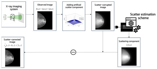 After artificially introducing the scatter component, scatter correction was performed using a virtual grid software. Using the virtual grid software, the scatter component in the image was estimated and subtracted from the original image to obtain a scatter-corrected image. A schematic representation of the scatter correction process is shown in Figure 3 [20].