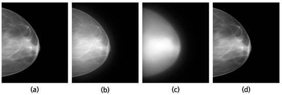 The two-dimensional (2D) scatter point spread function (sPSF) illustrates how a point source of light is ambiguously represented due to scattering. The 2D sPSF is used to describe the ambiguity caused by scattering, as scattered light disperses in various directions when passing through an optical system, causing the point source of light to spread more widely, resulting in image blurring [18]. The 2D sPSF represents the intensity of the PSF in x and y coordinates, depicting how this light scatters and diffuses ambiguously, thereby generating a certain shape around the light source. In this study, a 2D sPSF was utilized with scatter fraction () = 0.39 and scatter range () = 4.02 to simulate the scattering component by introducing artificial scattering into the acquired breast X-ray images. The values of and were estimated by measuring the log contrast ratio on a PMMA phantom by Ducote et al. The expression for sPSF is as follows [19]: