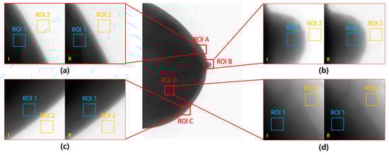 Figure 7 shows the enlarged ROIs used to measure the CNR and COV. CNR values were measured for each ROI, from ROI A to ROI D, within both ROI1 and ROI2, and the COV values were measured within ROI1. ROI A represents the upper part of the breast, ROI B the nipple area, ROI C the lower part of the breast, and ROI D the internal tissue within the breast. In ROI D, the aim was to compare the areas with high and low densities within the breast tissue.