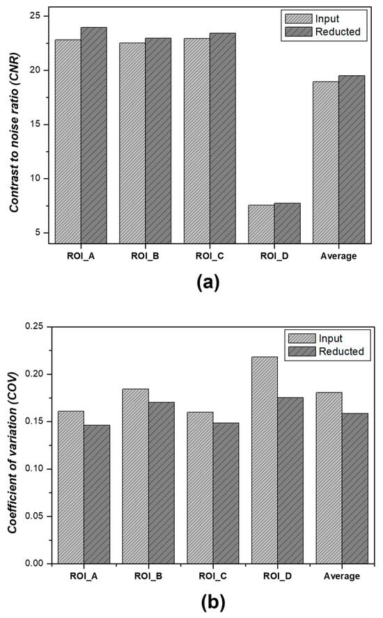 The CNR and COV measurement results for each ROI are shown in Figure 8. We measured the CNR and COV for both input and denoised images in each of the regions of interest (ROI A, ROI B, ROI C, and ROI D) and represented the results graphically.