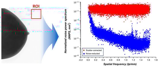 To analyze the noise and spatial resolution characteristics of the image by estimating the noise amplitude variations, the NNPS was measured. The measurement results are shown in Figure 9. To measure subtle noise fluctuations, we established an ROI, as depicted in Figure 9, given that it is imperative to conduct measurements in an area characterized by minimal signal variability within the background. The NNPS measurement results confirmed that noise reduction led to improvement in the spatial resolution characteristics of the image across all frequency ranges.
