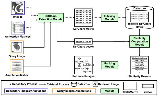 This section introduces a proposed ImR framework, as shown in Figure 1, retrieving images with similar irregular patterns in industrial or healthcare datasets through the use of DefChars. The Python code for utilising our proposed ImR framework is provided in a GitHub repository (https://github.com/edgetrier/ImgRetreival-DefChars accessed on 12 December 2023). The proposed ImR framework consists of two main processes: the repository process and the retrieval process. The repository process employs two key modules, the DefChars extraction module and the indexing module, to construct a datastore. This datastore contains a DefChars matrix extracted from annotated images that include irregular patterns. The retrieval process, on the other hand, relies on three modules: the DefChars extraction module, the similarity computation module, and the ranking module. These modules are used to search for images with similar irregular patterns within the datastore by comparing the extracted DefChars vectors.