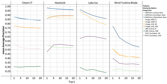 ImR performance when using the proposed DefChar-based methods. The highest mAP among the DefChar-based methods had an average of 0.90 ± 0.07 when using the Manhattan metric. Also, the retrieval performance was relatively balanced across all classes within the dataset; the AP for all classes exceeded 0.94 at and 0.74 at , which was higher than for other DefChar-based methods.