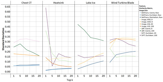 ImR performance when using the proposed DefChar-based methods. There were two similarity metrics (i.e., cosine and Euclidean) that yielded the highest mAP and the lowest std., averaging 0.85 ± 0.06. In terms of retrieval performance for each class using the cosine or Euclidean metric, both metrics had the same mAP values and std. values for class 1. For class 2, the Euclidean metric achieved a slightly higher AP of 0.01 compared to the cosine metric at and . Conversely, the cosine metric outperformed the Euclidean metric by 0.01 in AP at and for class 3. Additionally, the Manhattan metric showed noteworthy retrieval performance for the chest CT dataset and relatively achieved the highest AP for classes 1 and 2. However, for class 3, the retrieval performance of the Manhattan metric was slightly lower than those of the cosine and Euclidean metrics, with an average difference of 0.01–0.02 at , , and . This resulted in a higher std. in mAP, despite the metrics having the same mean mAP values.
