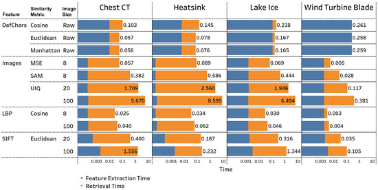 - In the initial step (DefChar extraction module) of the experiment, feature sets are extracted:Feature set 1 contains the raw images that have been compressed into four different sizes (i.e., , , , ) with the dual goals of normalisation and acceleration of the retrieval process. Hence, feature set 1 has four subsets of features each corresponding to a different size.Feature set 2 contains DefChars extracted from raw images. Raw images should be utilised when extracting DefChars, due to information loss caused by image resizing.Feature sets 3 and 4 contain LBP and SIFT features extracted from each of the feature subsets described in feature set 1. The parameters of LBP were set to radius = 1, sample points = 8, and method = uniform, following the recommendations by Rahillda et al. [82] based on their experimental results. The SIFT parameters used in this experiment were set according to the guidelines by Lowe [80]: nFeatures = max, nOctaveLayers = 3, contrastThreshold = 0.3, edgeThreshold = 10, and sigma = 1.6. The feature sets are separately stored (indexing module) in a datastore.