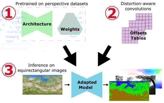 General adaptation process: 1. The architecture and weights come directly from pretraining on perspective datasets. 2. The convolution layers are modified using a precomputed shift table that takes into account equirectangular distortions. 3. Finally, we directly use spherical images as input in the adapted model to predict the modalities for which the network was pretrained.