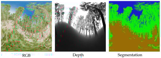 Using the best rendering capabilities of Unreal Engine [24] and the forest textures from its marketplace, we create a photorealistic forest environment with complex lighting and dense foliage. We propose, in this paper, RWFOREST: a dataset of 1000 equirectangular RGB images with associated ground-truth depth and semantic segmentation provided by the AIRSIM [25] plugin. Three semantic classes are distinguished: trees, ground, and sky. The image resolution is for all. Additional results on higher resolutions are provided in Appendix A. Figure 3 presents a sample of the RWFOREST dataset.