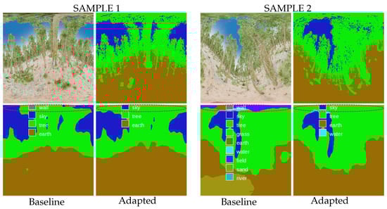 In addition, the adaptation also reduces the number of noisy predictions. Some objects in the equirectangular images are highly distorted, resulting in false class predictions by the network. In sample 2, the upper polar region of the adapted version is less noisy and contains almost no false predictions.