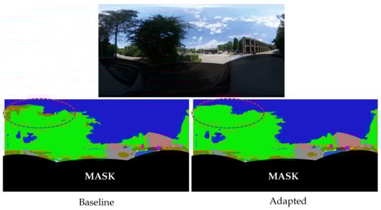 A mask is added to the image’s lower part to hide the car’s semantic segmentation estimate. Indeed, the car’s shape is strongly distorted due to its proximity to the omnidirectional camera. The absence of such images and nearby objects in the training dataset makes the network unable to make a correct prediction. Spherical adaptation improves the quality of semantic segmentation in spherical images but remains limited by the training dataset, as in all supervised methods.
