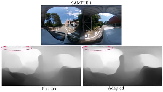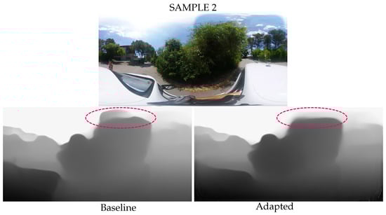For real image examples, we focus on predicting the distance of objects in the upper polar region during urban driving scenes. Figure 7 and Figure 8 show two image acquisitions, the first as the car passes under a bridge and the second as it drives by a large tree. Similarly to the results on the virtual images and semantic segmentation examples, the detection of shapes is improved in the polar regions and there is less erroneous depth estimation. Sample 1 shows that the spherical adaptation improves the depth prediction in the polar regions of the equirectangular images. In the upper left of the image, the bridge depth estimation is more accurate and smoother due to better local pixel coherence. In addition, sample 2 shows that the adapted prediction is less sensitive to illumination noise. The image contrast in the top polar region shows significant differences due to the sun configuration. The baseline network interprets these changes as depth differences, while the adapted model is more robust and remains accurate.