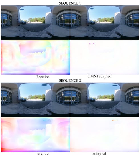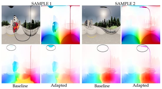 The optical flow enhancements are clearly visible as objects move into the polar regions of the equirectangular image. Figure 9 shows two optical flow estimates in the dataset Flow360. In both examples, the car passes under a streetlight. Due to the improved local pixel coherence provided by the distortion-aware convolutions, the adapted network is able to track the path of the streetlight in the upper polar region of the image. As a result, the estimated optical flow is close to the ground truth. In parallel, the non-adapted network has difficulty detecting this same streetlight. Consequently, the flow prediction is inaccurate in sample 1 or even empty in sample 2.