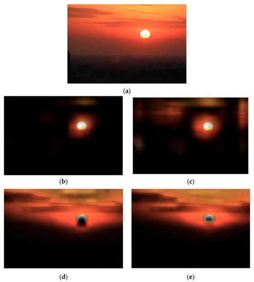 Model A is trained by transfer learning based on the resNet18, and model B is trained based on the architecture of model B3. The score assigned by model A is 5, and the score assigned by model B is 4. Meanwhile, the ground truth of this image in the XiheAA dataset is 4. From the results, it can be seen that the FFP and the AIR extracted by model A is the sun, and that this is the subject of the image rather than its surroundings; meanwhile, the FFP and AIR extracted by model B is the red cloud around the sun that reflects the composition of the image. The sun is in a position that seems to meet the rule of thirds, so that the score assigned by model A is higher than the ground truth. Meanwhile, the layout of the cloud is dull, so that the score assigned by model B is 4, which is the same as the ground truth. This observation is consistent with the above expectation that model A extracts the subject of the image for predicting an image’s AS, and model B extracts the holistic composition for the prediction.