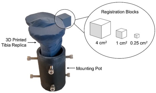 Three-dimensional printed tibia replica within a mounting pot showing the placement of the cubic registration block. Three separate tibia replicas were printed with each block size (cross-sectional area of cube face = 4, 1, and 0.25 cm2).