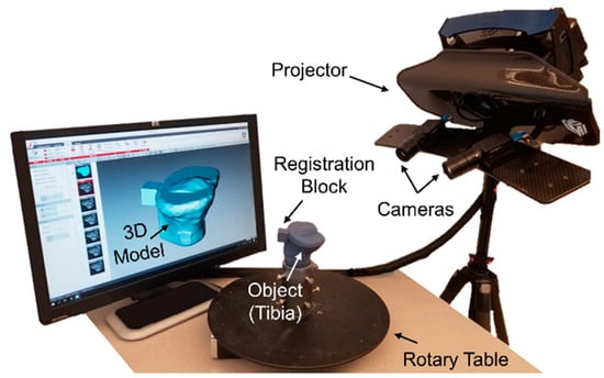 The 3D optical scanner. The projector emits a light pattern upon a rotated object of interest (tibia), while two cameras record the distortion of the projected light. The scanning software then converts these data into surface coordinates to create a 3D model.