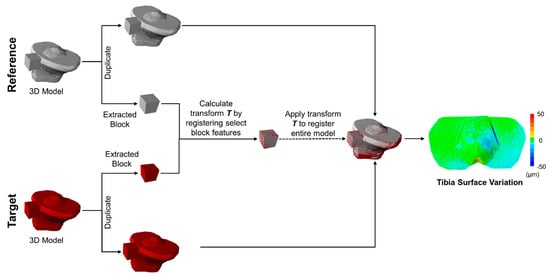 Flowchart of the post-processing methodology to measure surface variation. Three-dimensional models of target and reference objects were registered, and the linear surface variation was recorded as the mean deviation between the registered objects. Registration of the whole object (tibia) used the transformation matrix computed between the manually extracted registration blocks of the target and reference 3D models.