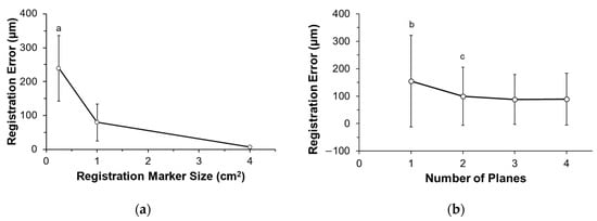 To determine whether different planar configurations would influence registration accuracy, we varied the configurations for the one-plane and two-plane cases on the large registration block. For the one-plane case, we evaluated the registration error using planar surfaces 1, 2, 3, and 4 separately. For the two-orthogonal-plane case, we assessed the following planar configurations: 1-2, 1-3, 1-4, 2-3, 2-4, and 3-4. The lowest registration errors occurred when using plane 1 for the one-plane case and planes 1-2 for the two-orthogonal-plane case (block errors of 9.8 ± 5.3 µm and 4.8 ± 0.9 µm, respectively), and the highest registration errors occurred when using plane 3 for the one-plane case and planes 3-4 for the two orthogonal plane case (block errors of 46.8 ± 41.2 µm and 25.4 ± 22.1 µm, respectively). However, any differences in the registration errors between the planar configurations for both the one-plane and two-plane cases were not significant (p > 0.05; one-way ANOVA).
