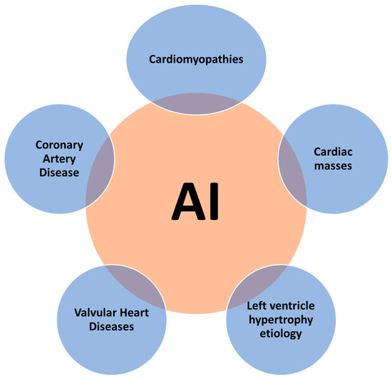 The rationale behind the use of AI in echocardiography to identify disease states is based on its capacity to automatically analyze features from images and data that are beyond human perception [36]. During routine echocardiography, a huge volume of potentially diagnostic information could be underutilized, considering that the totality of data generated can be hard to interpret by human experts in a short time period [37]. AI can help identify the true value of these undiscovered findings and can analyze this information faster than human experts. Therefore, the potential clinical applications of AI in echocardiography are rapidly increasing, including the identification of specific disease states and processes, such as valvular heart diseases, coronary artery disease, hypertrophic cardiomyopathy, cardiac amyloidosis, cardiomyopathies, and cardiac masses (Figure 2).
