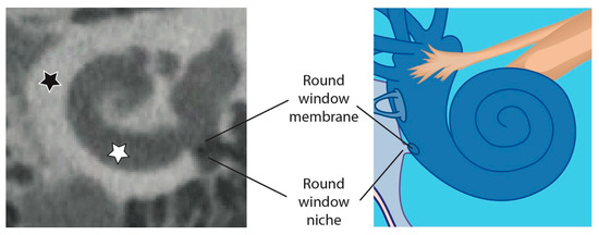 The temporal bone is a major part of the lateral skull base that contains critical structures including the middle ear, the inner ear, cranial nerves, and numerous vessels [13]. The only two connections between the middle and inner ear are the oval and round windows that are covered by the stapes footplate and round window membrane (RWM) [14], respectively. The RWM is a semi-permeable membrane that, in human temporal bones, is located deep in a recess called a round window niche (RWN) that is formed by individually very differently shaped bones (Figure 1) [15,16,17,18,19].