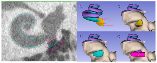 RNI creation using the developed semi-automated software as 3D Slicer™ plugin. (a) A CBCT slice of the basal turn of the scala tympani (cyan) with the implant including handle (pink) sitting inside the RWN. (b–e) 3D visualization of the individual steps, that are also visible as outlines in (a). (b) Four control points are placed, defining the RWM (yellow) and limiting the backside of the implant body. (c) The bone (light gray) surrounding of the RWN is segmented by thresholding, allowing the RWN to be filled (cyan, d). In a last step, a handle is added to the implant (pink), helping to define the orientation of the implant.