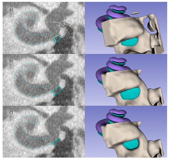 The manually segmented RNI did not fit into the corresponding RWN in all three temporal bones. The volume of the RWN seemed to be too large to pass the border of the bony edges of the RWN. Several attempts to press the manually segmented RNI into the corresponding RWN failed (Figure 7).