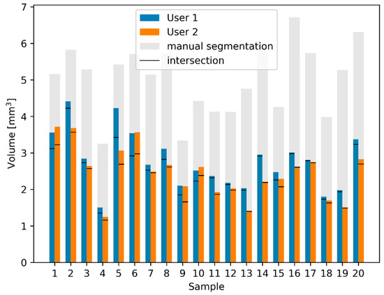 Comparison of calculated RWN volumes and intersections between manual and semi-automated segmentations. The blue and orange bars show the volume of the semi-automated segmentations as performed by the two users. Using the semi-automated method, only small differences between the two users exist. The manual segmentations have a much larger volume (gray). The black lines in each bar represent the volume of the intersection between manual and semi-automatic segmentations.